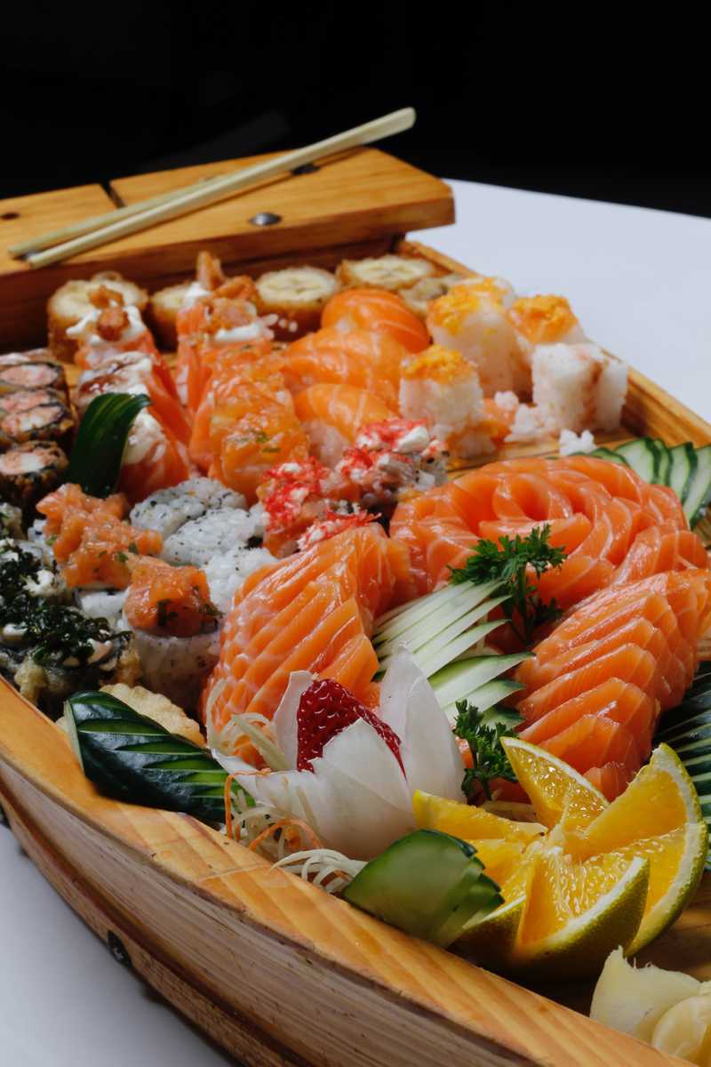 Tuna, salmon, yellowtail, tobiko and avocado wrapped w. cucumber